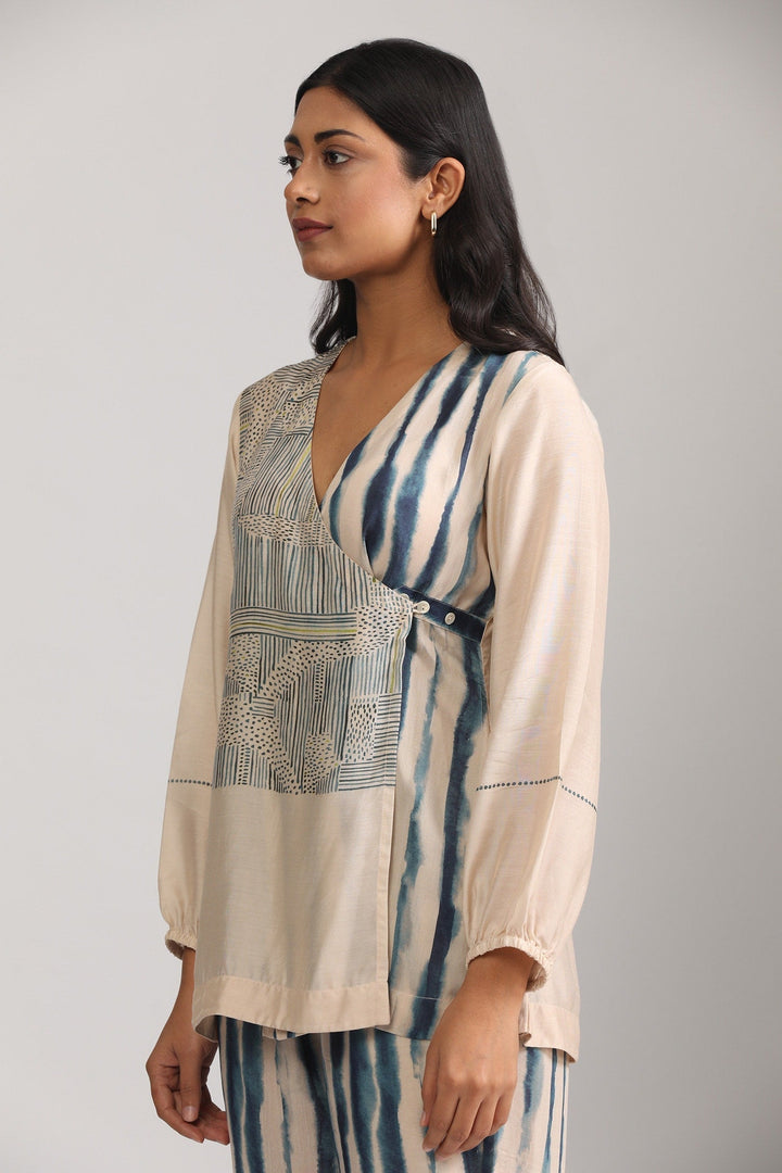 Beige Cotton Silk Printed Geometric V Neck Wrap Top And Pant Set