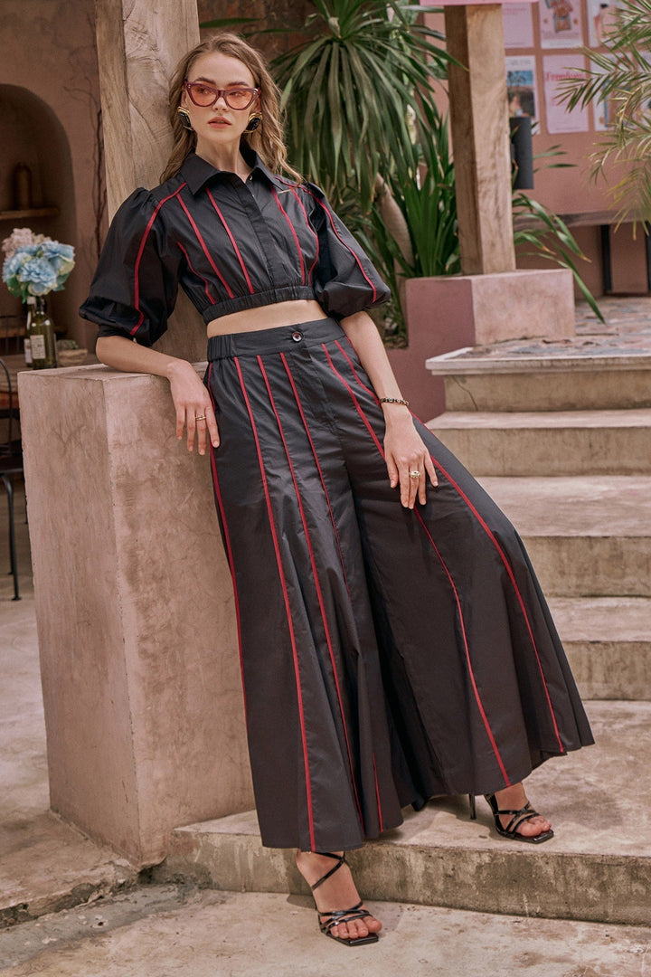 Black 100% Cotton Poplin Embellished Pipe Collar Nate Top And Pant Set