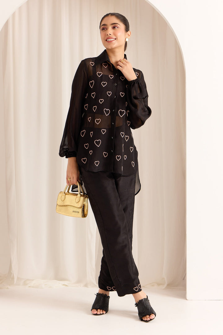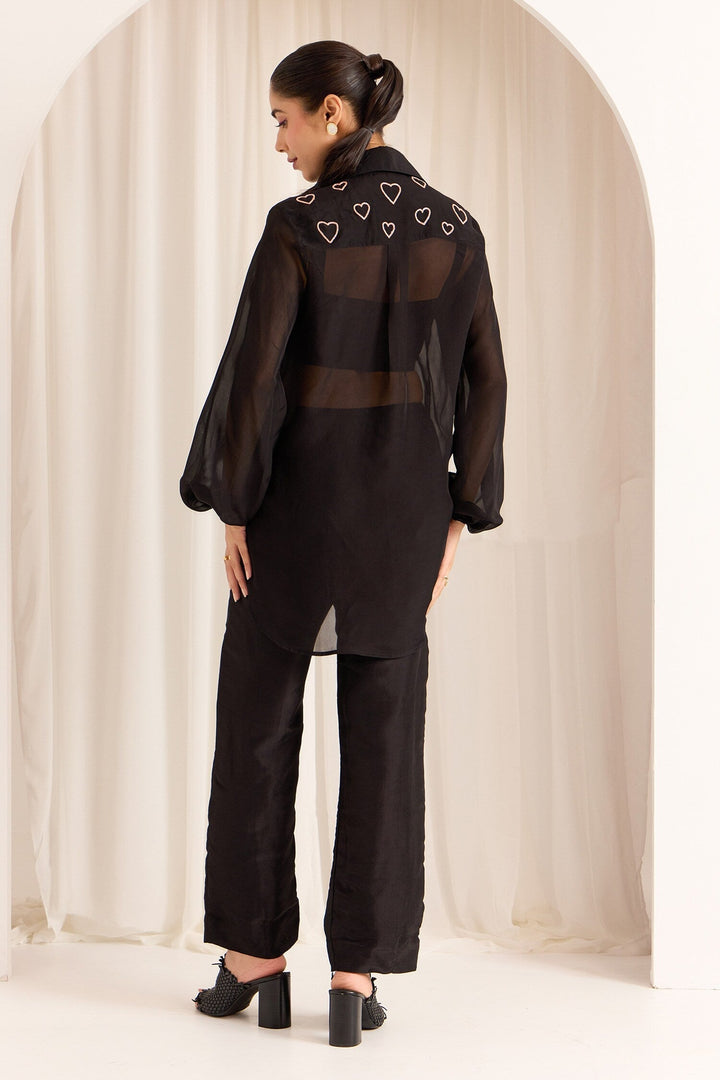 - Black Silk-Organza Shirt, Pant, and Bustier Set