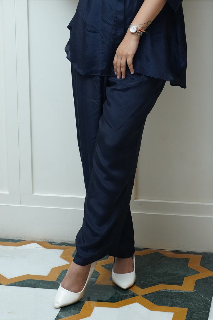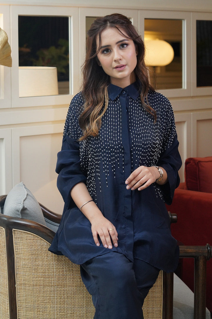 Blue Crepe Embellished Bead Shirt Collar With Pant