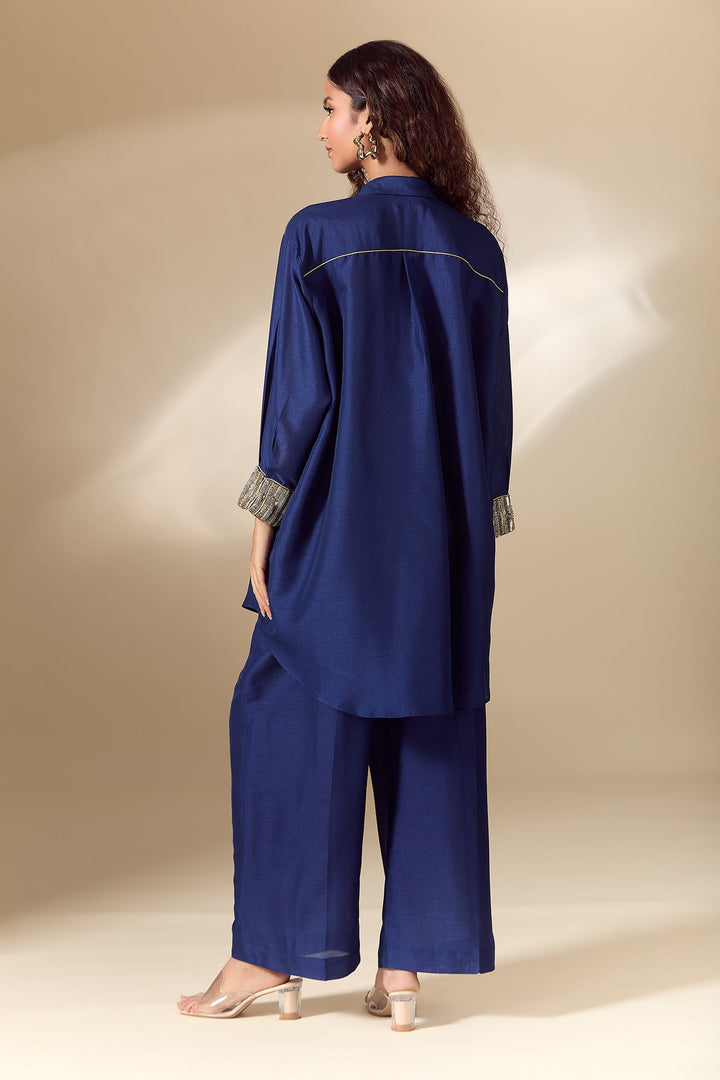 Blue Silk Blend Embroidery Pearl Work Cuff High Low Shirt With Flared Pant