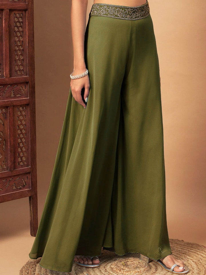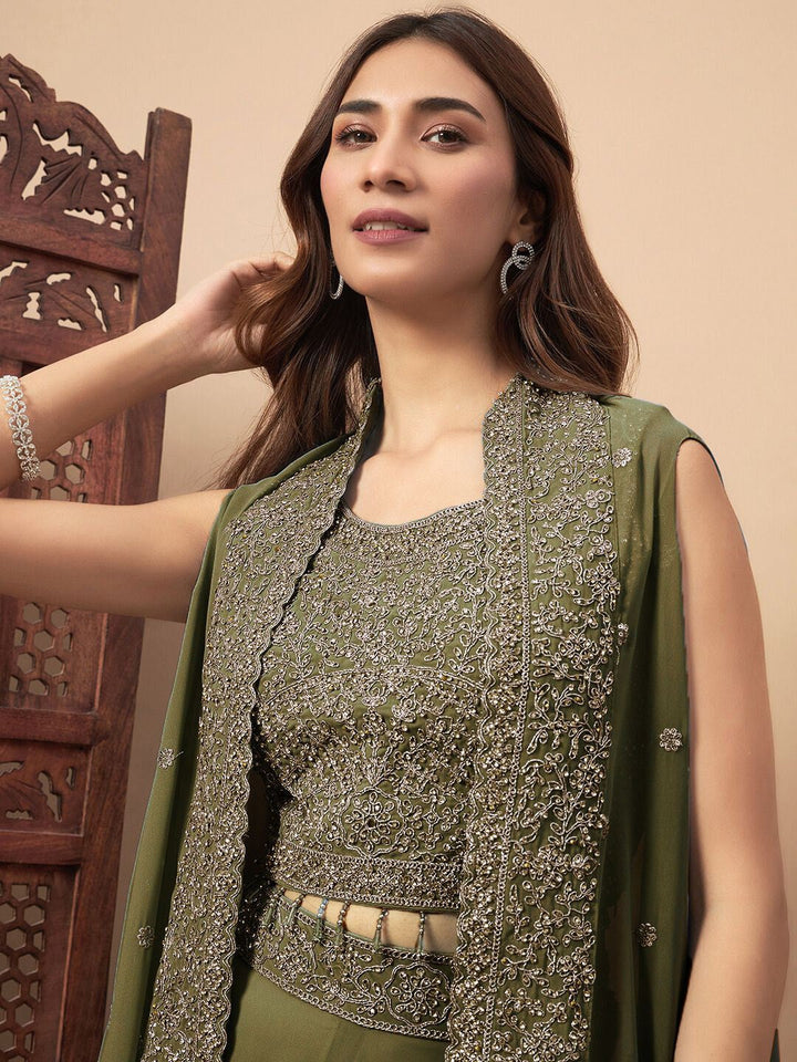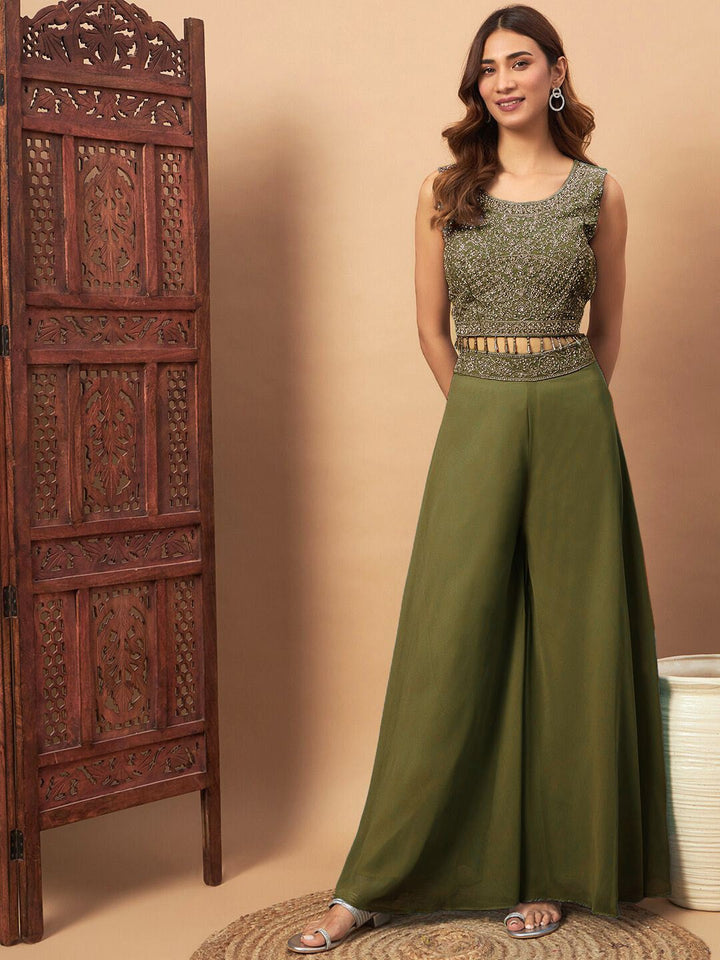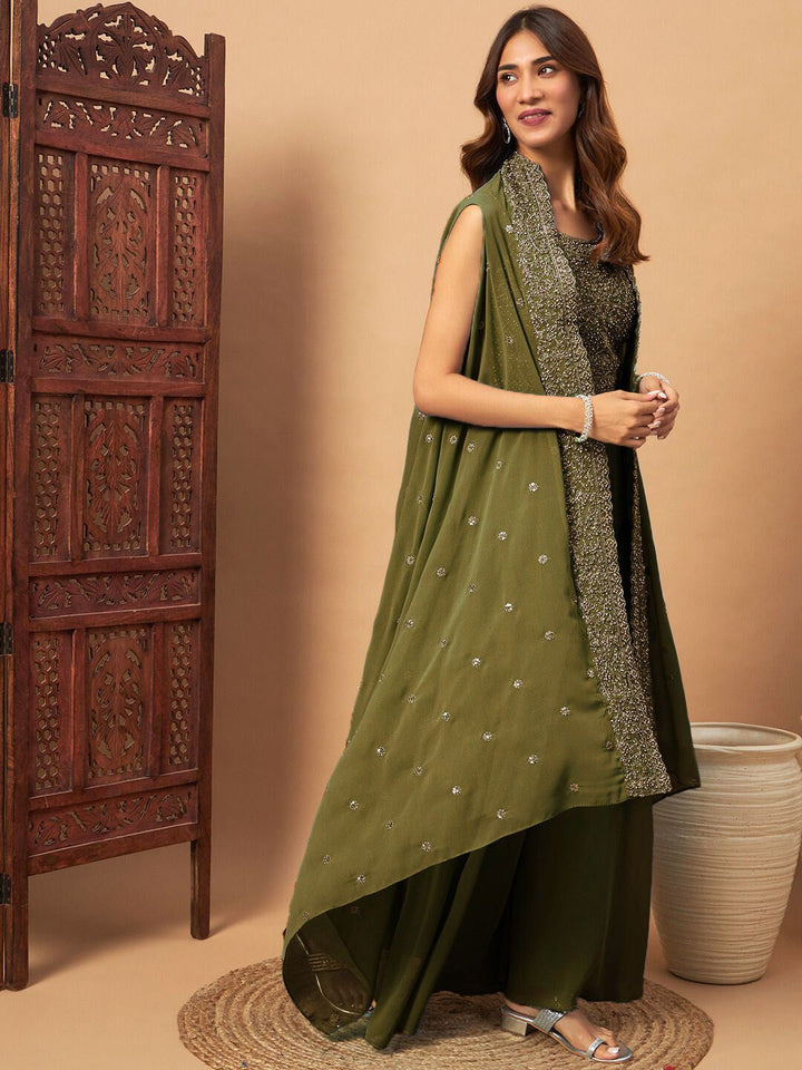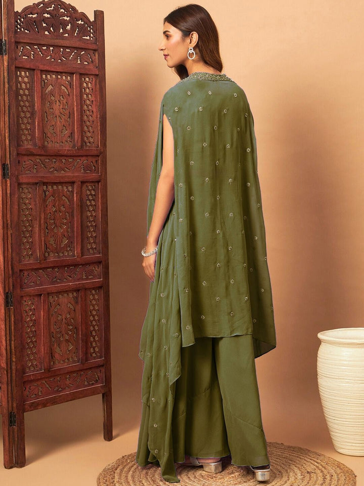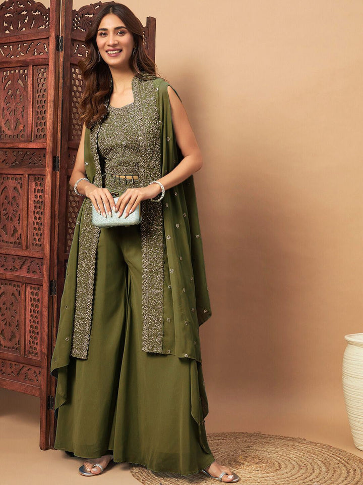 Embellished Round Neck Georgette Top & Palazzo With Shrug