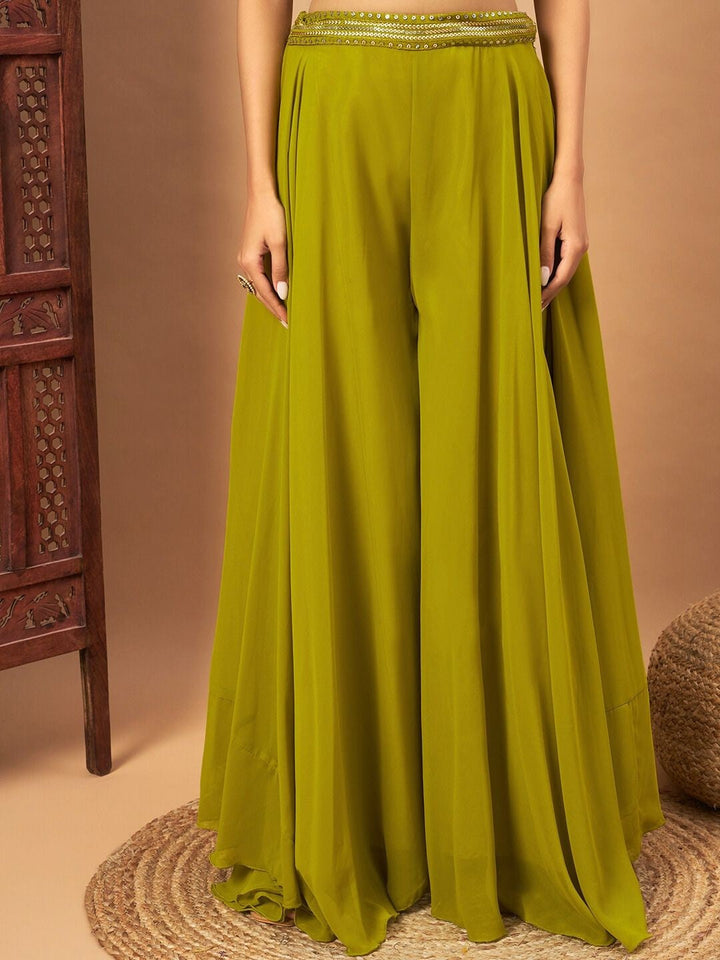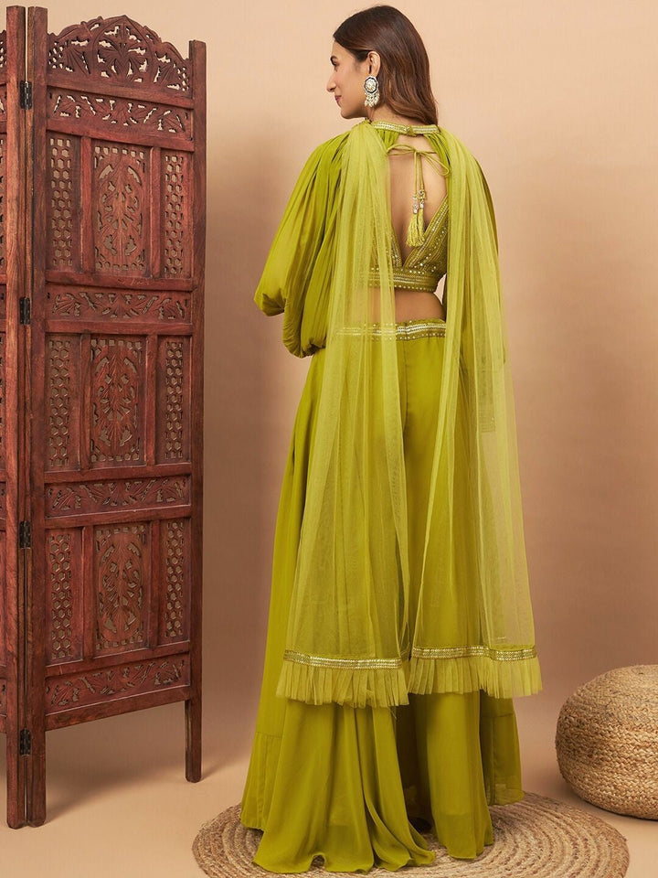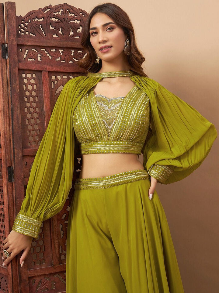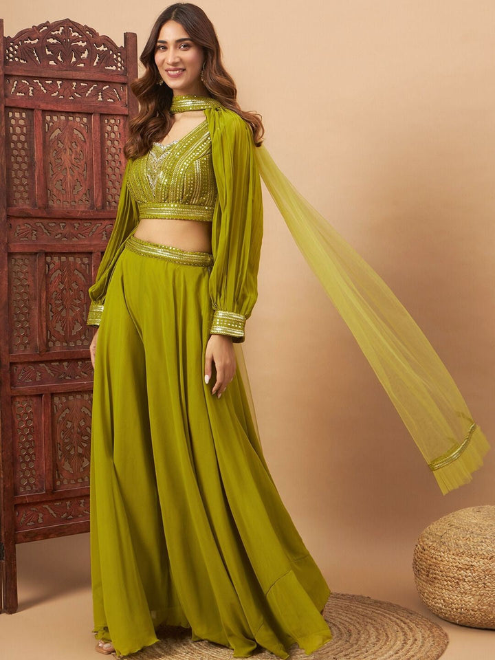 - Package Contains: 1 crop-top, 1 palazzo, 1 bishop sleeves, 1 dupatta