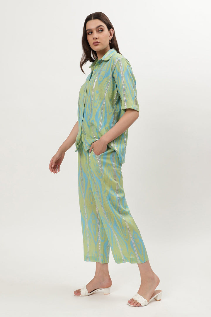 Green Cotton Crepe Print Ikat Collared Neck Nicole Shirt With Pant
