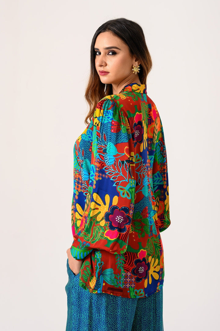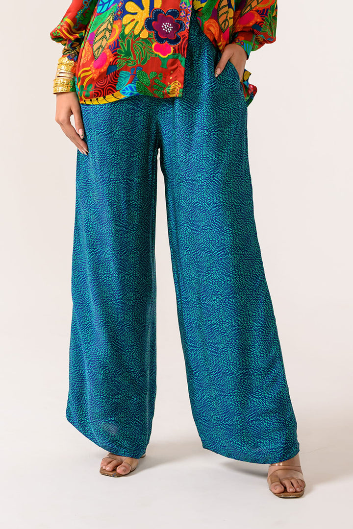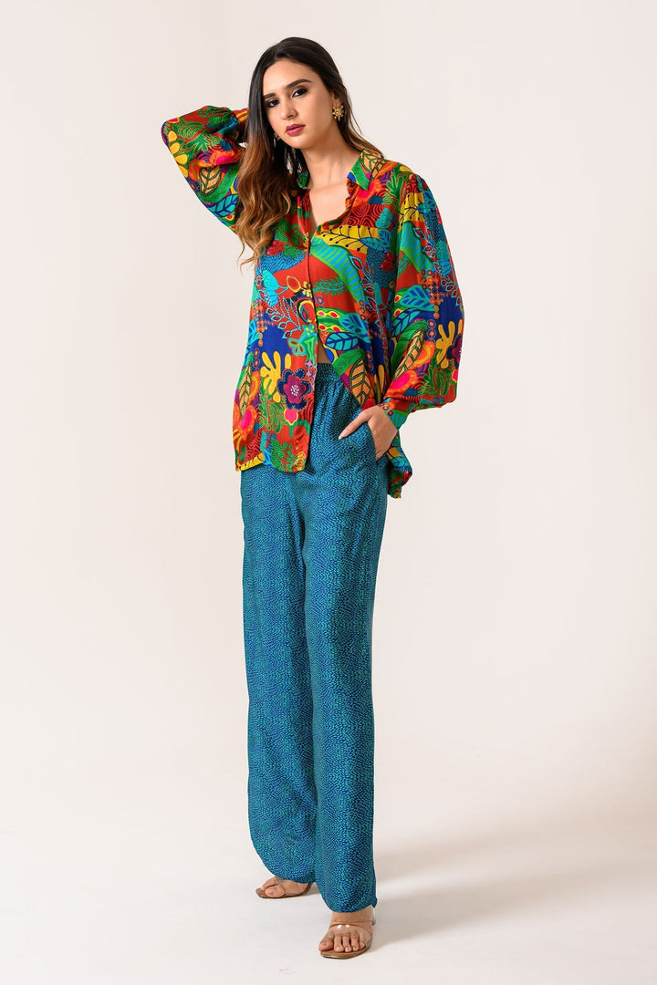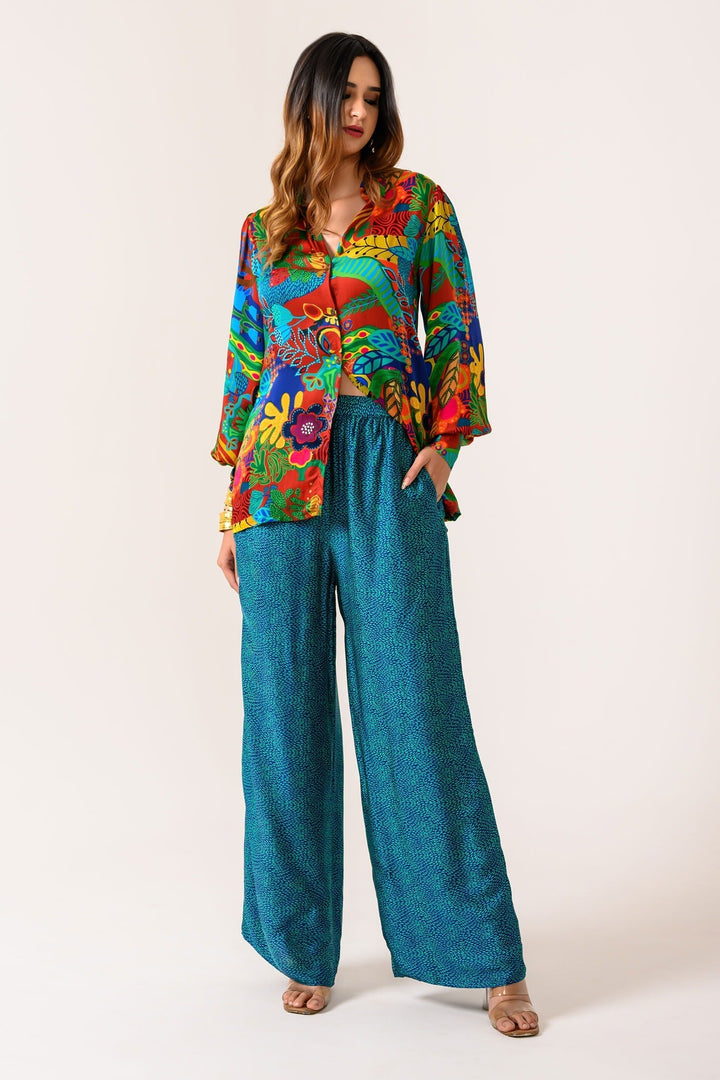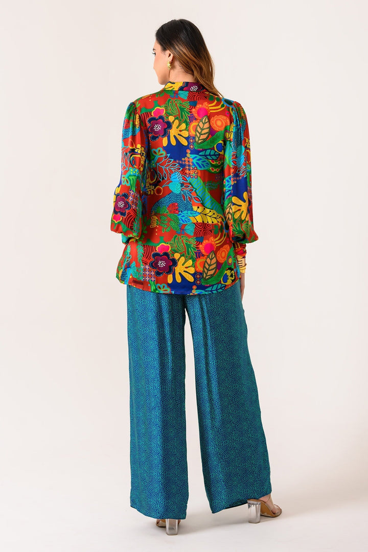 - Turquoise and Multi-Color Silk Satin Shirt and Pant Set with Cuff Sleeves