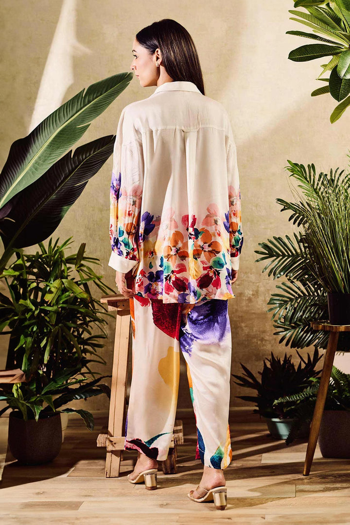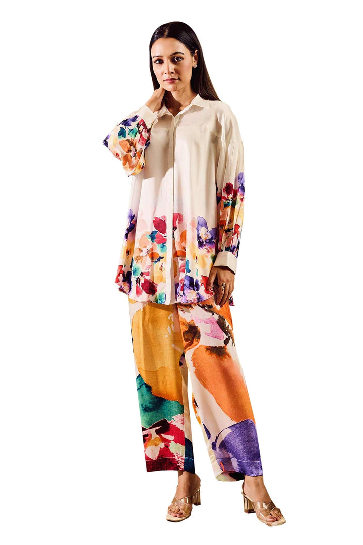 - Off-White & Multi-Color Satin Shirt and Pant Set