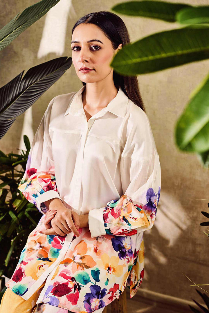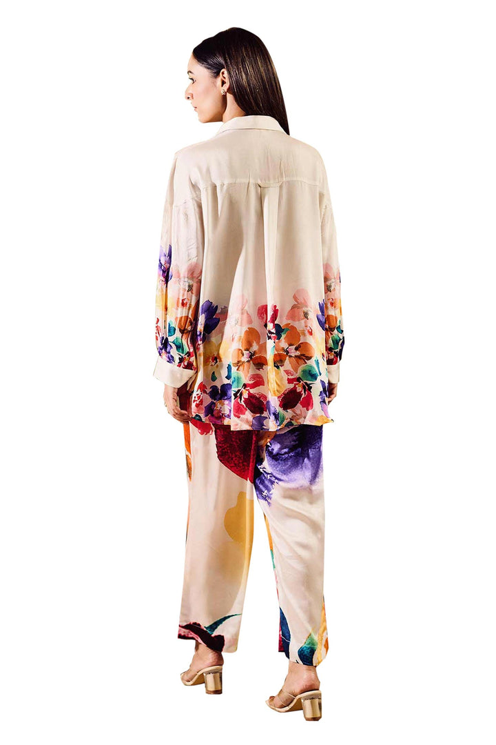 Off White Cupro Satin Print Floral Collared Neck Shirt With Pant