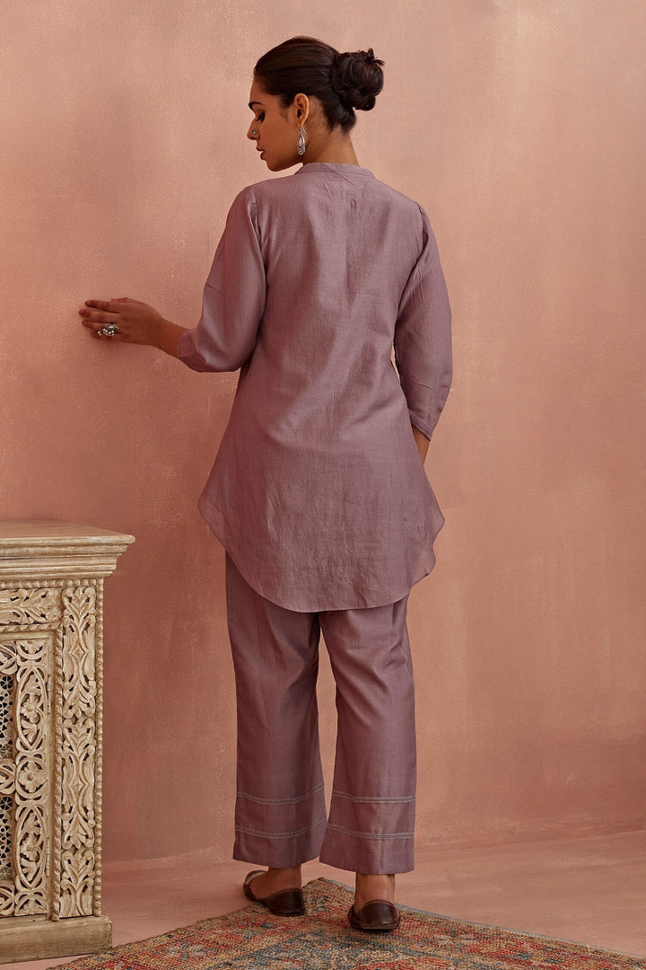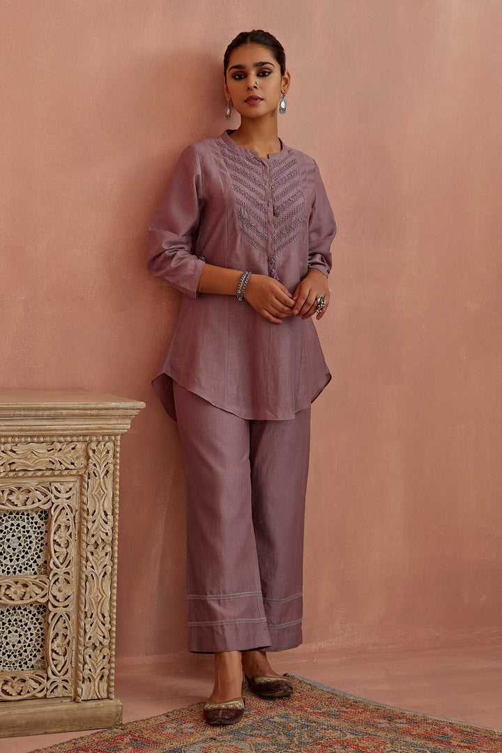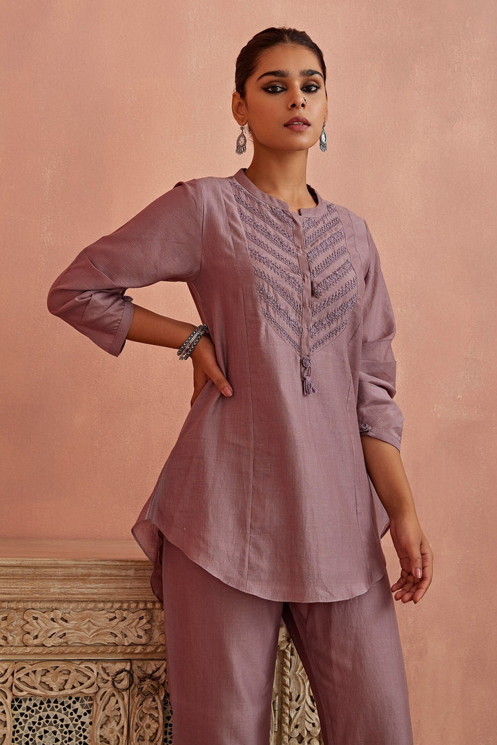 Purple Chanderi Embroidered Thread Band Collar Yoke Top And Pant Set