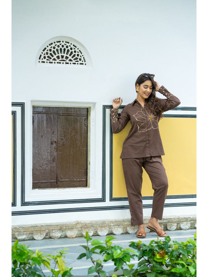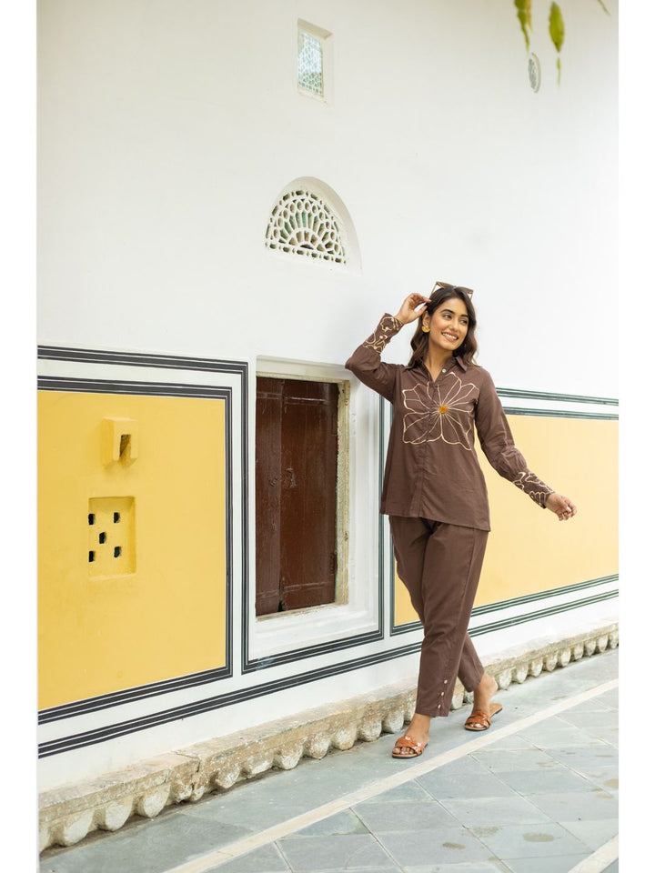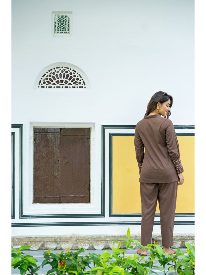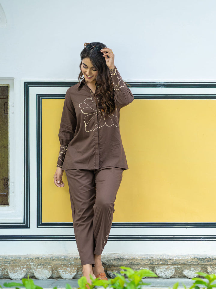 Whimsical Wings Walnut Brown Cotton Co-Ord For Women (Set of 2)