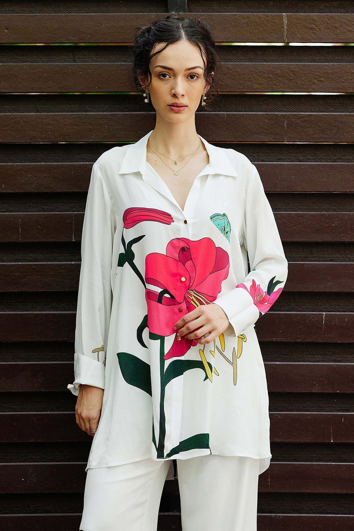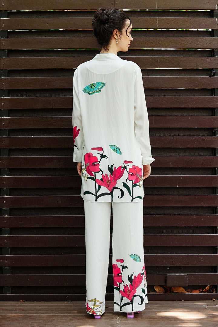 White Natural Crepe Printed Floral Collared Repose Shirt With Pant