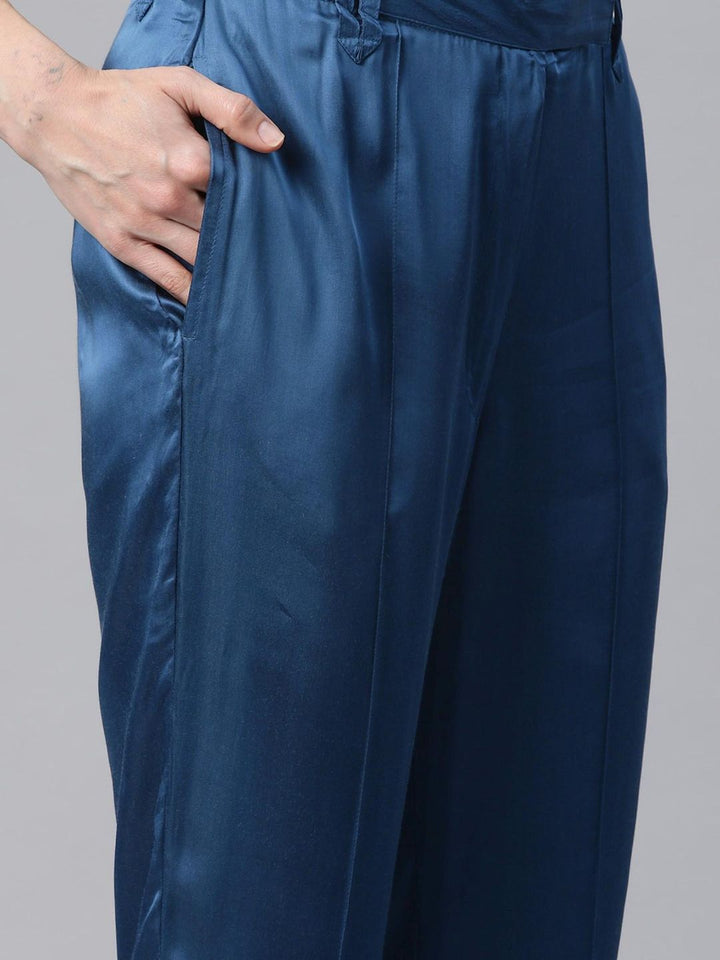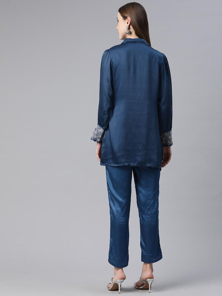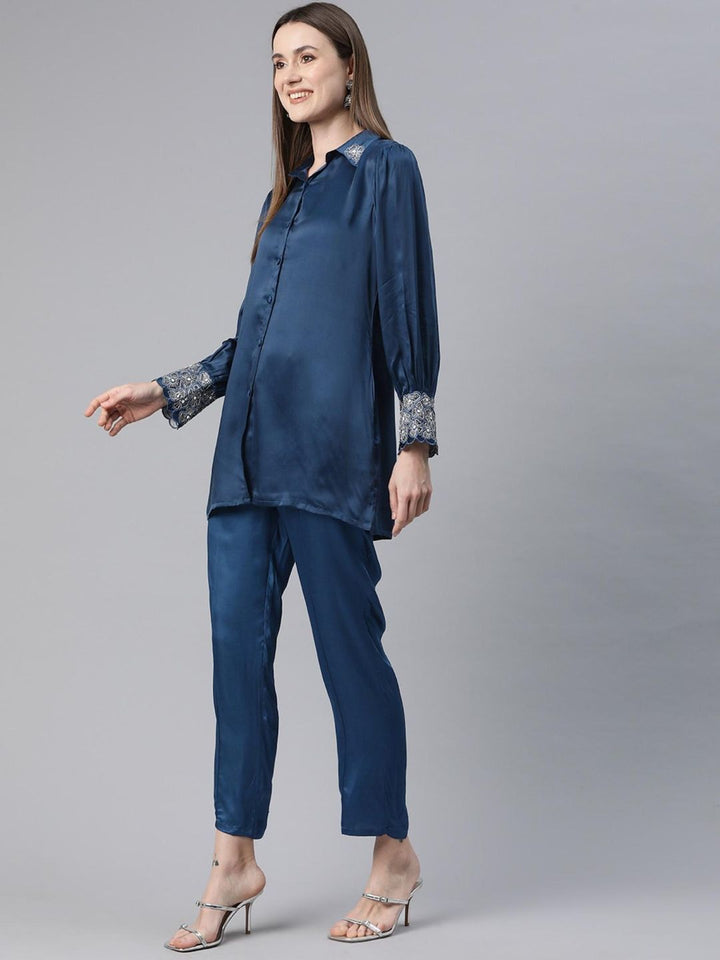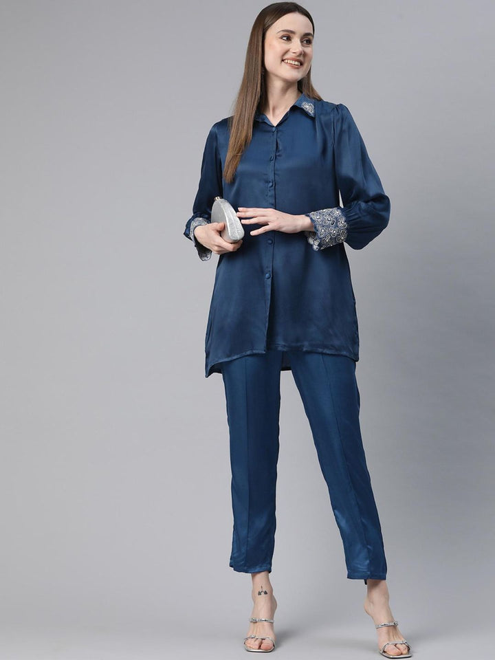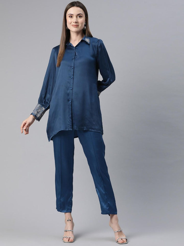 Women'S Blue Shirt Style Silk Co-Ord (Set of 2)